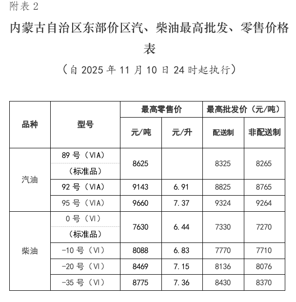 一、自2025年11月10日24时起,我区汽、柴油价格(标准品)每吨分别上调125元和120元,非标准品汽、柴油最高零售价格按照国家规定的品质比率也相应调整(具体价格详见附表)。成品油零售企业可在不超过汽、柴油最高零售价格的前提下,自主制定具体零售价格。